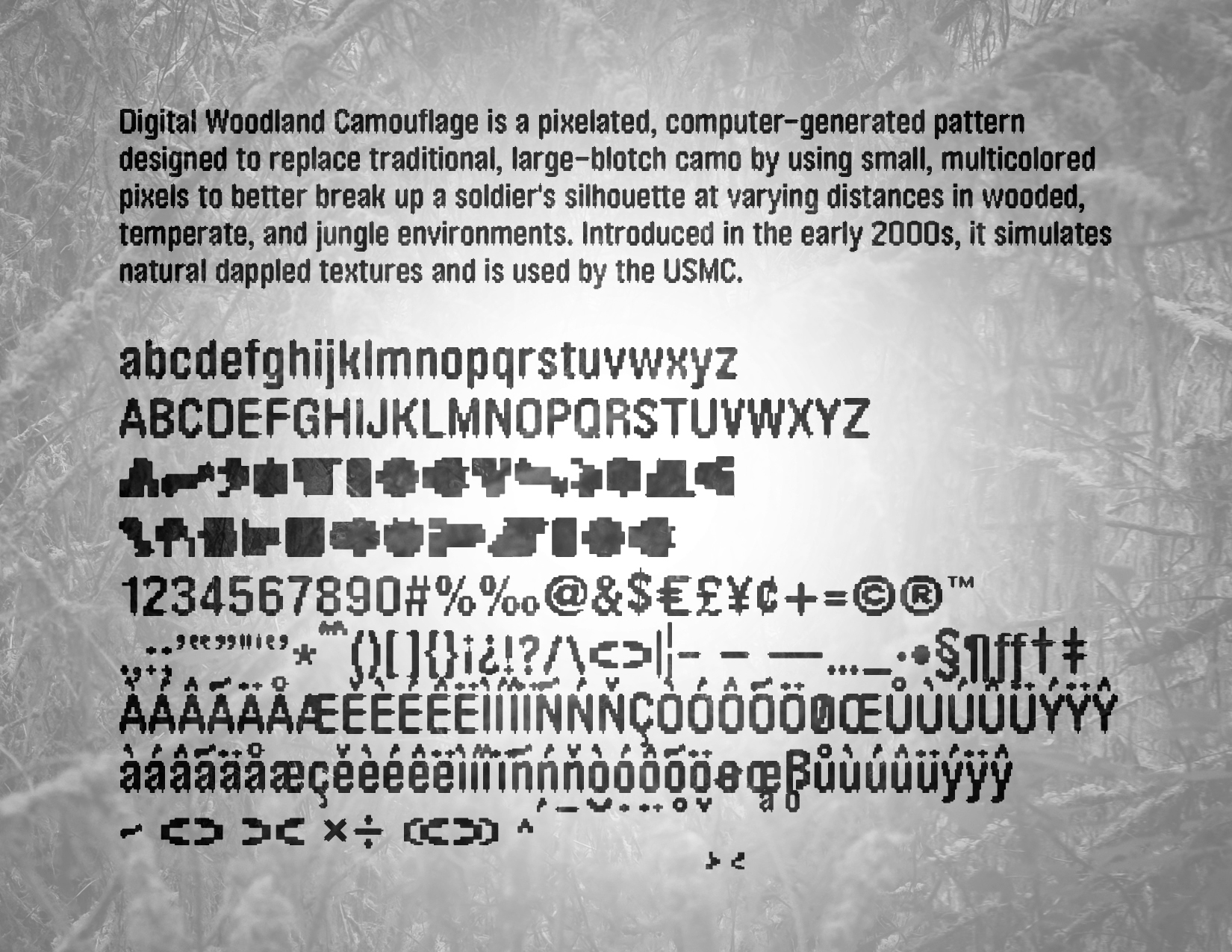 Inspired by the pixelated camouflage patterns and bold, utilitarian letterforms of the U.S. military, this typeface strikes a curious balance between the tactical and the surprisingly organic. It feels engineered yet slightly improvised—like something that might have been stenciled onto a crate, reprogrammed into a satellite interface, and then accidentally turned into a font. Please use it for good.